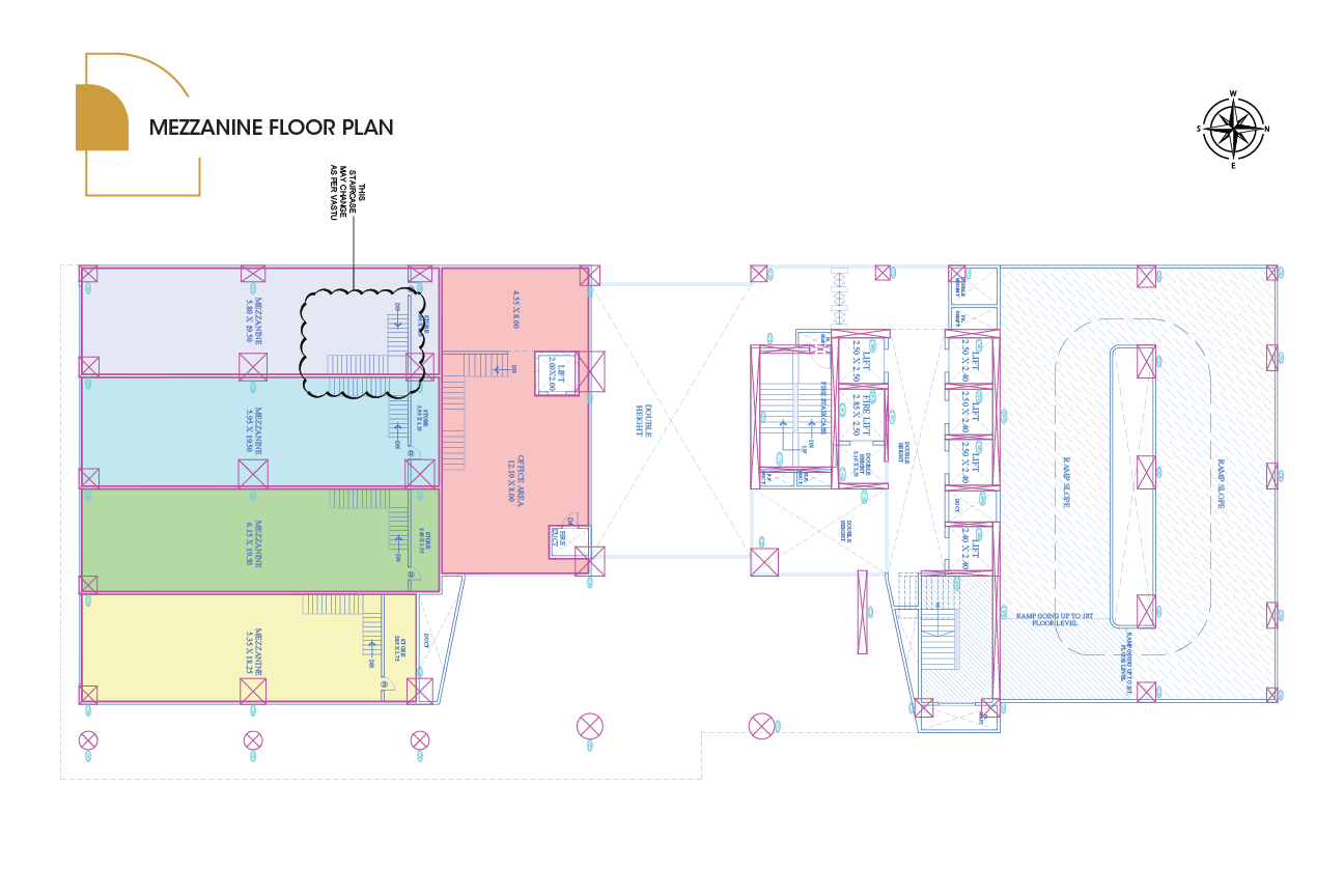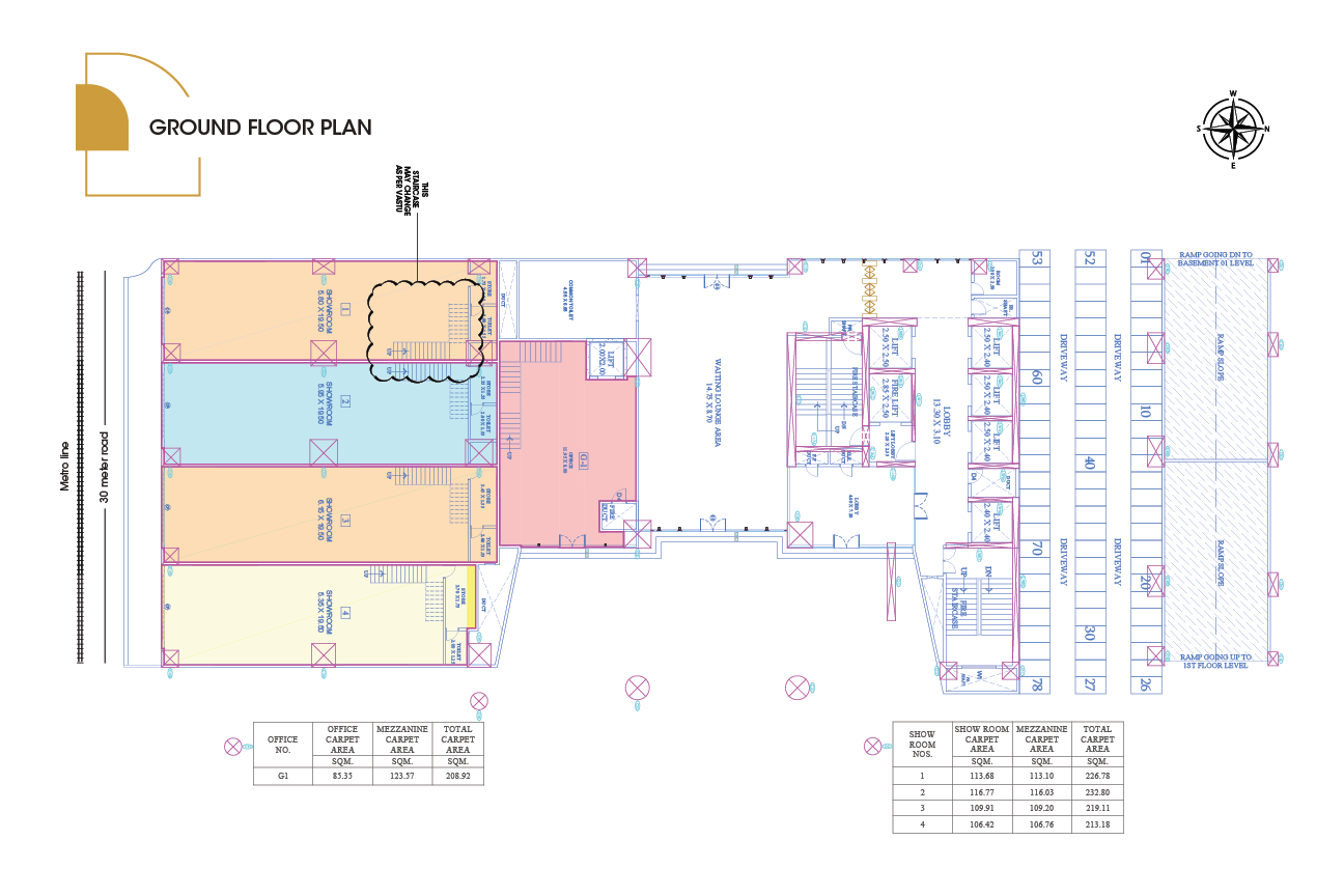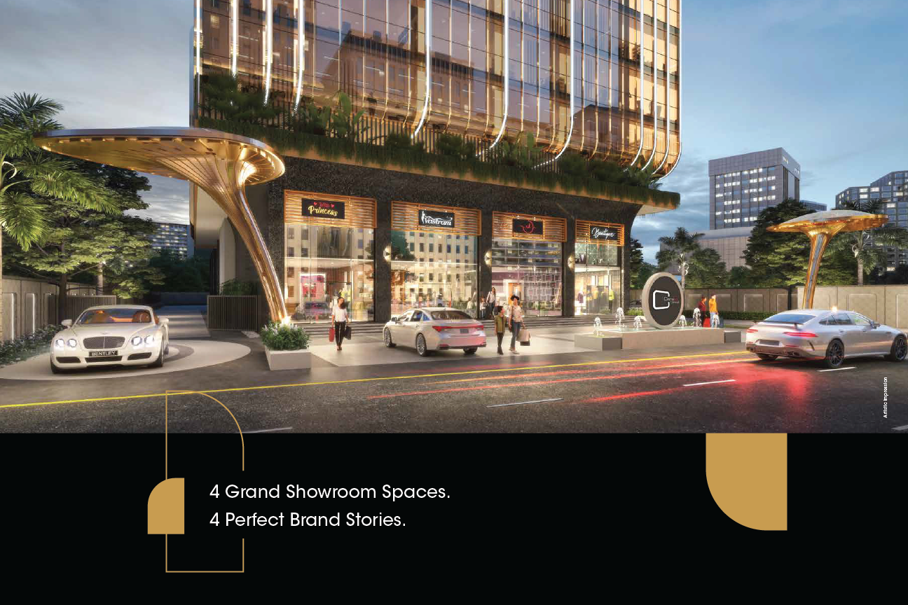 Showroom Spaces: 4 premium showrooms ranging from 2,300–2,500 sq.ft, each with a mezzanine and an impressive 28ft height for next-level retail presence.